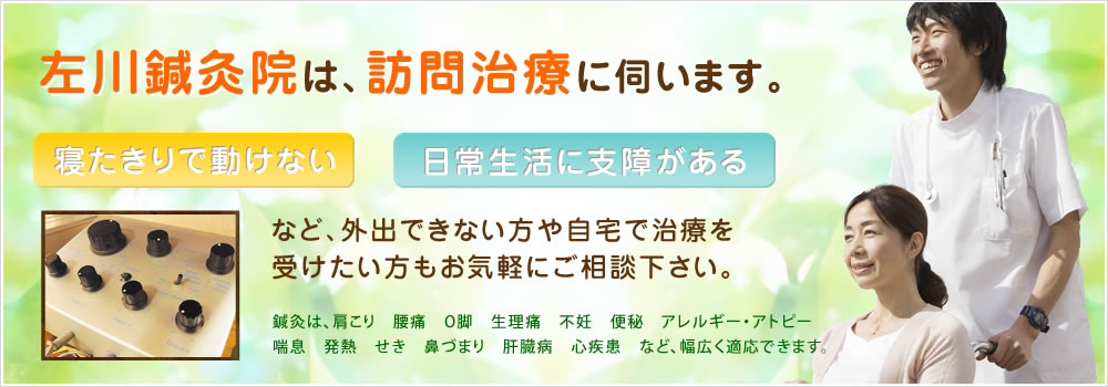 大阪府富田林市にあるリハビリ・マッサージの左川鍼灸院です。当院では訪問治療を中心に、鍼、灸、指圧での治療を行なっております。